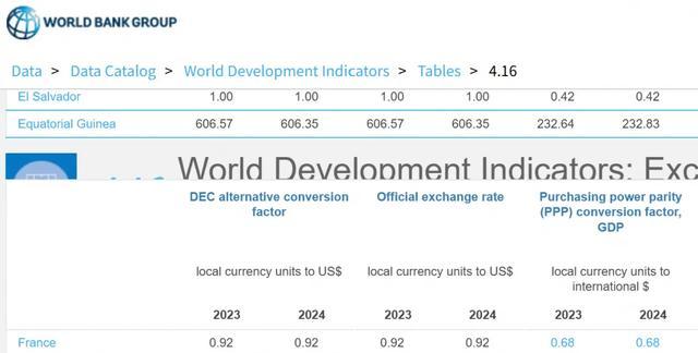 再看了下法国的欧元PPP汇率,欧元兑换美元官方汇率是0.92欧元=1美元,2023年和2024年用PPP汇率变成 0.68欧元=1美元。