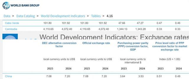 这个不是我随便说的,下图来自世界银行官网,人民币兑换美元的PPP(购买力平价)汇率,2024年是1美元=3.53元人民币,2023年是3.64元人民币,而美元兑换人民币汇率2023年和2024年分别是7.08和7.2,
